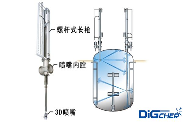 德高潔全自動不銹鋼反應(yīng)釜清洗系統(tǒng)具體清洗流程是將三維旋轉(zhuǎn)噴頭伸縮機(jī)構(gòu)安裝在反應(yīng)釜入孔上,伸縮桿伸進(jìn)反應(yīng)釜內(nèi),伸縮機(jī)構(gòu)可采用手動、電動、液壓等控制,伸縮桿在反應(yīng)釜內(nèi)伸縮和沿反應(yīng)釜內(nèi)壁周圍方向移動。根據(jù)具體實際情況可選用2孔或4孔三維自動旋轉(zhuǎn)噴頭,當(dāng)三維自動旋轉(zhuǎn)噴頭水平旋轉(zhuǎn)時,水射流形成的旋轉(zhuǎn)力矩帶動噴嘴在垂直面內(nèi)旋轉(zhuǎn)。由于三維旋轉(zhuǎn)噴頭與伸縮桿的復(fù)合運動,高壓水射流可以覆蓋反應(yīng)釜內(nèi)任何位置,從而完成反應(yīng)釜的清洗。
